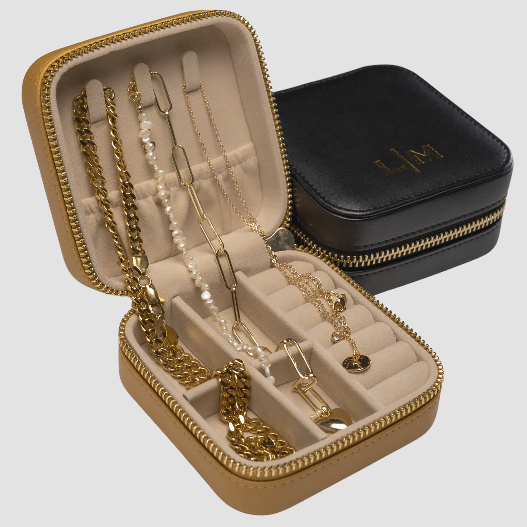 La Madison's Travel Jewelry Box provides secure storage for up to 40 pieces, featuring specialized compartments for rings, necklaces, earrings, and tech devices. Crafted from 100% vegan materials, this stylish, ultra-compact case is the perfect travel companion for the modern traveler.